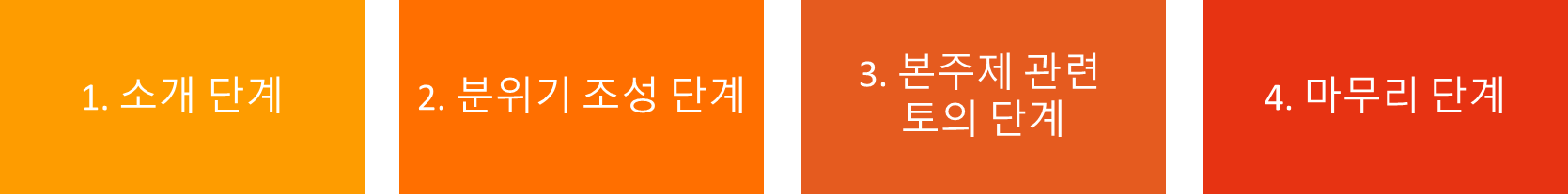 라포르 (Rapport) 형성 단계로 진행 규칙을 소개하고, 참여자들이 서로 격의 없이 토론할 수 있도록 유대감을 형성하는 단계입니다.