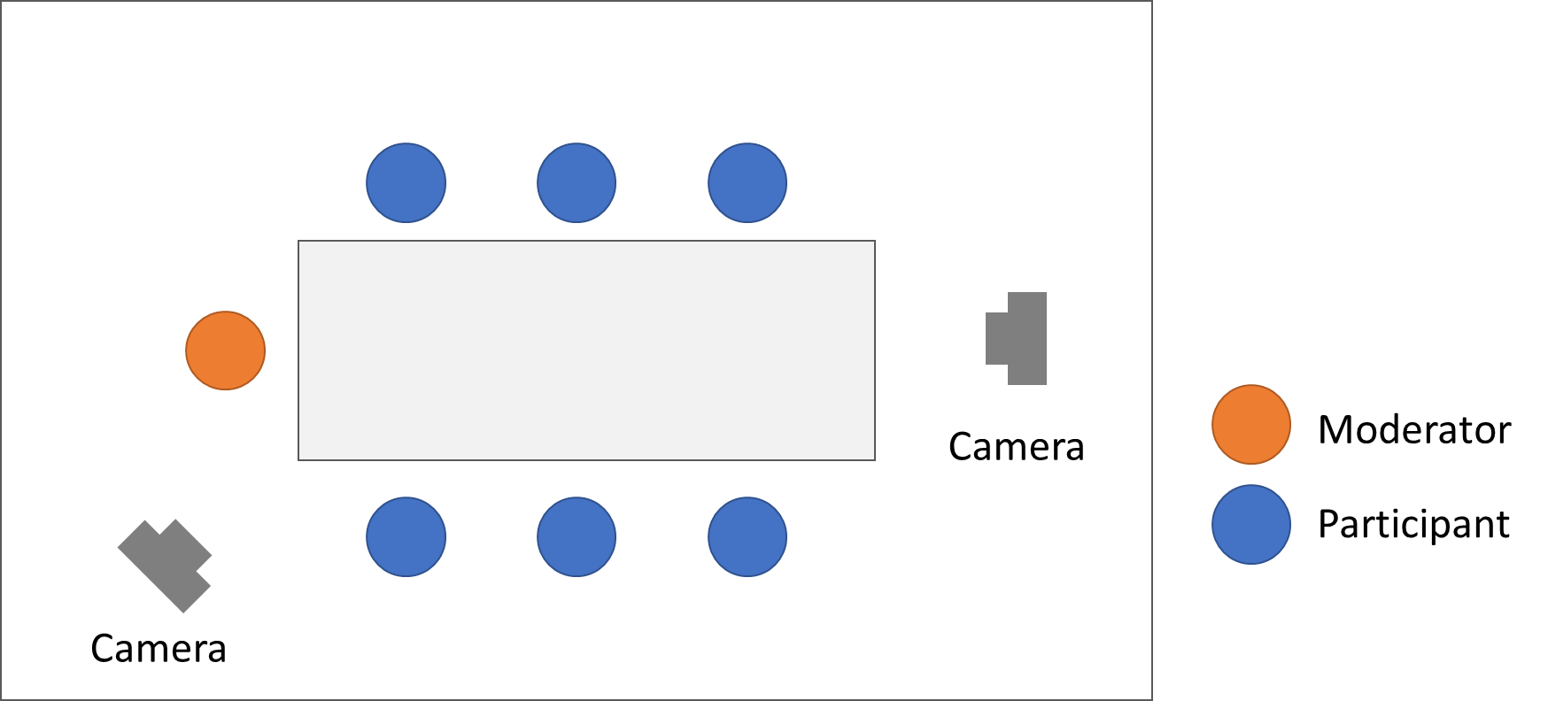 포커스 그룹 인터뷰 진행 시에는 모더레이터가 참여자를 모두 볼 수 있는 자리에 착석해야 하며, 참여자 전체의 발언과 행동, 표정을 담을 수 있도록 카메라를 배치하는 것이 필요합니다.